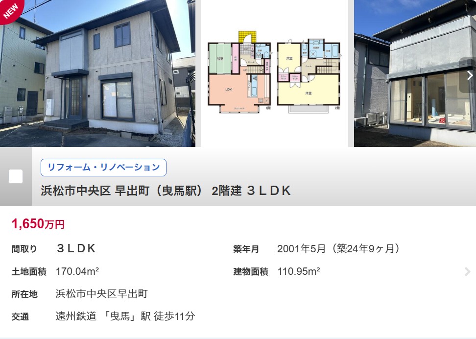 浜松市中央区早出町の中古住宅、1,650万円。リフォーム済みで駐車場3台、駅もスーパーも徒歩圏内。これだけの条件が揃って月々の支払いが6万円台というのは、定期借地権付き物件ならではのメリットです。