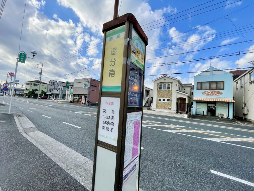 公共交通機関の主役は遠鉄バスです。最寄りのバス停「追分南」までは徒歩3分という近さです。 ここから「JR浜松駅行き」に乗車すれば、約30分強で市の中心部へ直結します。乗り換えなしで駅まで行ける点は大きなメリットであり、通勤・通学時間の読書やスマホチェックなど、貴重な自分時間として活用できます。雨の日、駅まで家族を送迎する必要がないのも助かるポイントです。